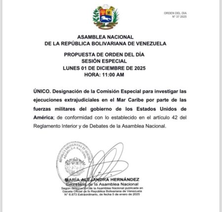 La Asamblea Nacional de Venezuela designará este lunes, en una sesión extraordinaria, una comisión especial de diputados y diputadas destinada a investigar los asesinatos de venezolanos ocurridos en aguas del mar Caribe.