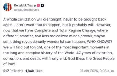 El presidente de Estados Unidos, Donald Trump, ha vuelto a amenazar a Irán. A través de un mensaje en sus redes sociales, el republicano ha advertido, a horas de que venza el ultimatum para reabrir el Estrecho de Ormuz, que «esta noche morirá toda una civilización, para no volver jamás. No quiero que eso suceda, pero probablemente ocurrirá».