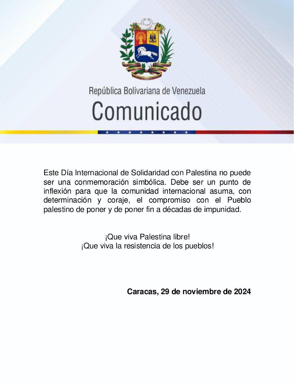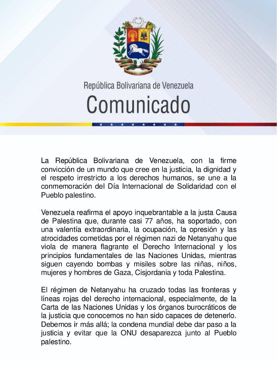 «Venezuela con la firme convicción de un mundo que cree en la justicia, la dignidad y el respeto irrestricto a los derechos humanos, se une a la conmemoración del Día Internacional de Solidaridad con el Pueblo Palestino», indicó el texto.