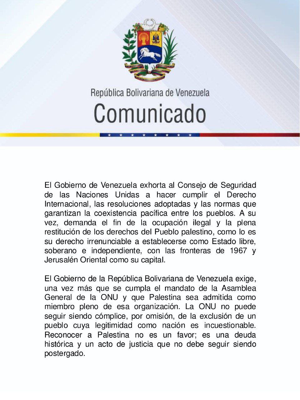 El Gobierno bolivariano afirmó que reconocer a Palestina no es un favor, sino “una deuda histórica y un acto de justicia que no debe seguir siendo postergado”.